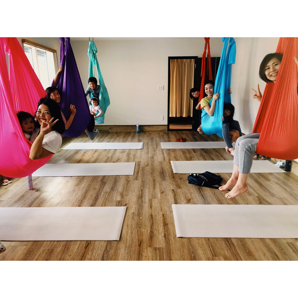 先日のエアリアルプライベートレッスン5名中4名が初めての方たちレッスン中に何回もおもしろーい!家にほしーい!を連呼恐怖心を捨てて無邪気に布を使って身体を動かす️…