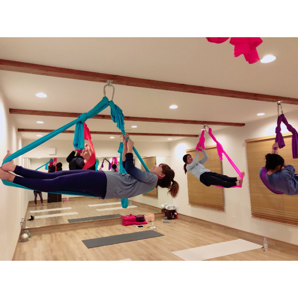 SORAYOGAのエアリアルヨガ🤸♀️本当に気持ちよくて楽しくて有意義な時間を過ごすことができます笑いあり、絶叫あり、終わった後の抜け殻感は最高🤸♀️生徒さ…