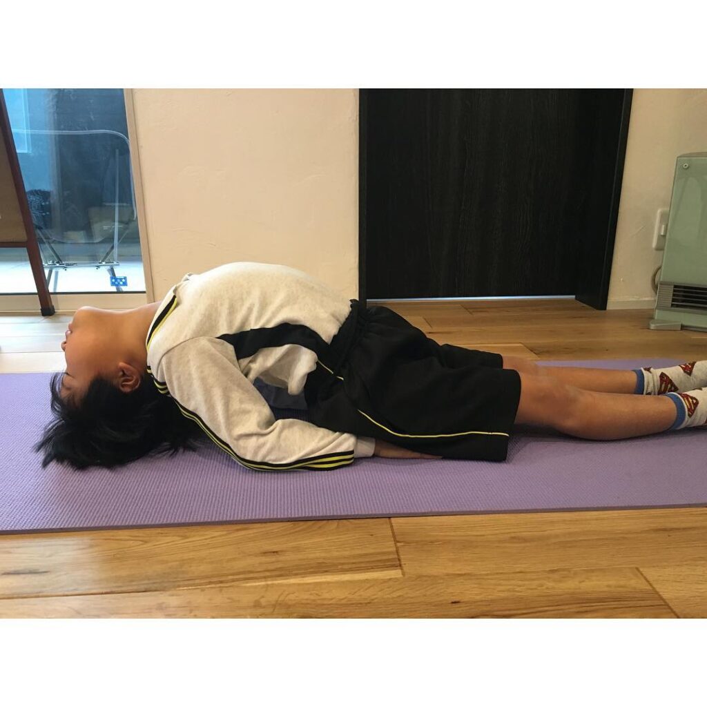 ・何度スヌーズボタン押しても眠り足りないって「つらい朝」には、、、これが一番・#マツヤアーサナ#魚のポーズ仰向けに寝て両足揃えて伸ばしておく。両腕、背中の下に、…