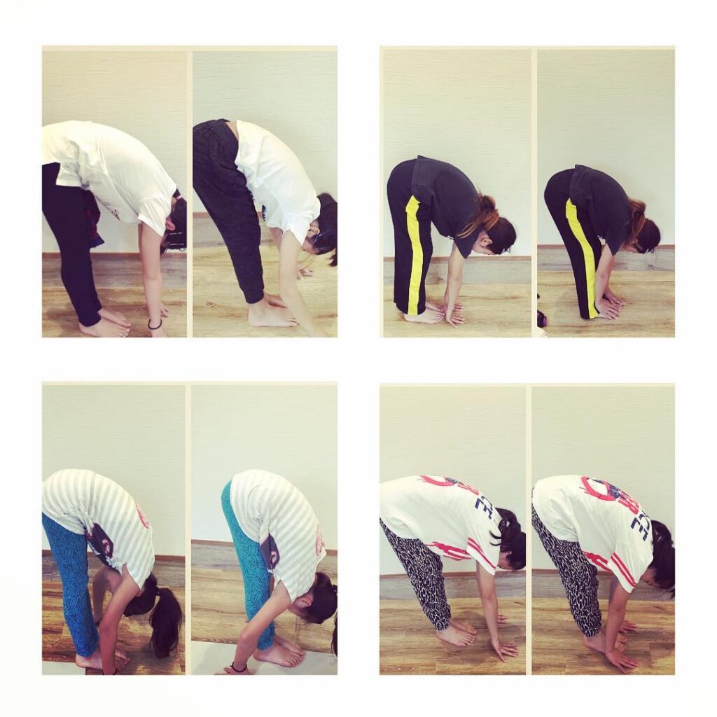 4人の小学生たちこの4枚の写真は左側before右側after🏻️あることをたった1分しただけで前屈が深まります・身体ってフシギ・#sorayoga #ヨガイン…