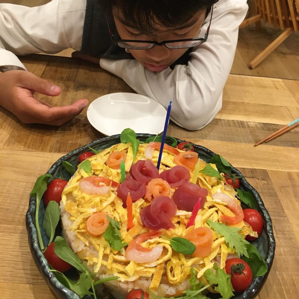 この方ケーキ嫌いなもので、寿司ケーキでハピバーりゅう14歳おめでとっマンツーマンでささやかに誕生日会ひまり塾、のんダンス、りん寝てる#誕生日#ハッピーバースデー…