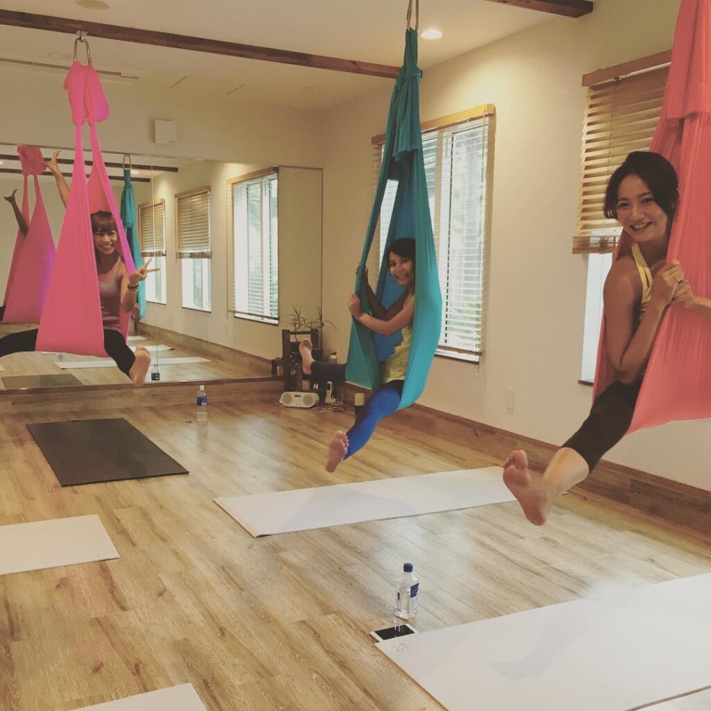 mai先生とanna先生とエアリアルの体験会️ヨガのお仕事に携わる2人でもエアリアルのすごさに感動してた!#エアリアルヨガ #arialyoga #SORAYO…
