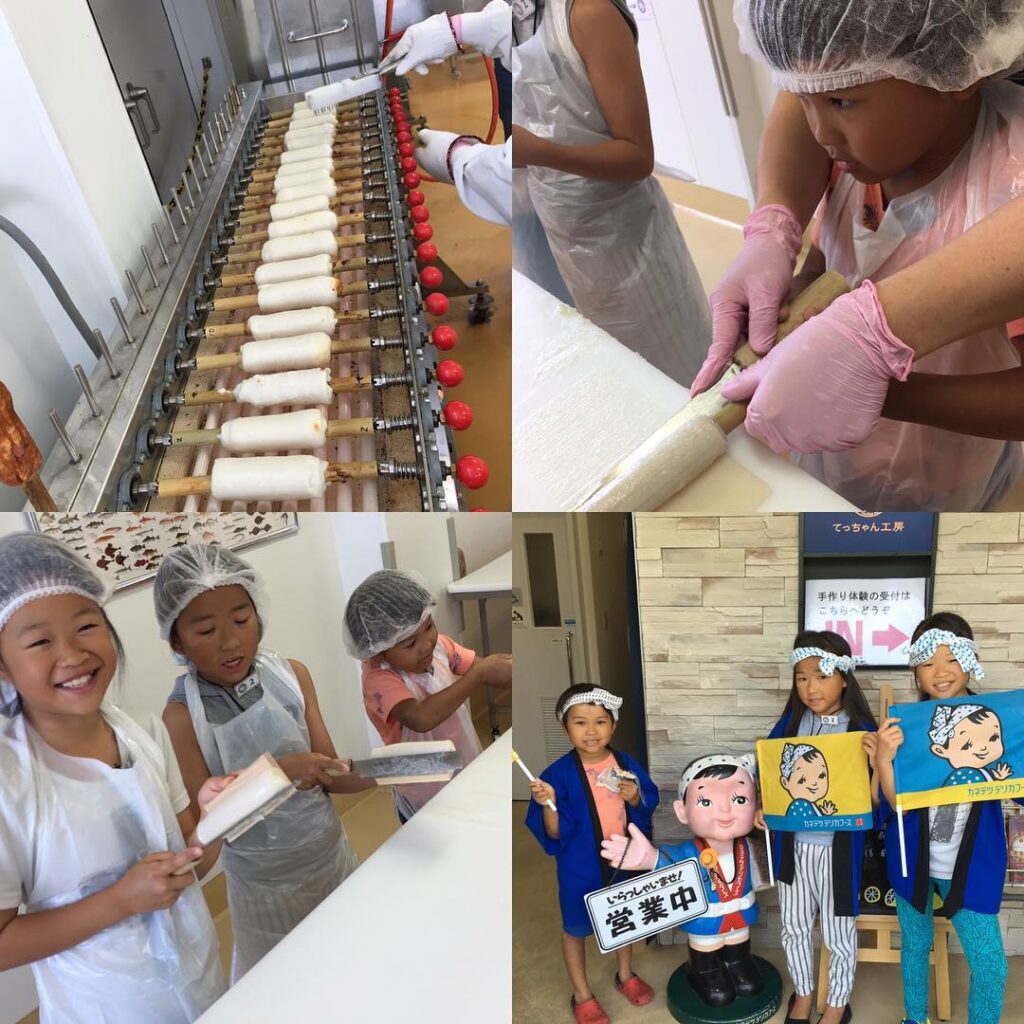 りんちゃんの自由研究はこれーーっ真剣にちくわ作りに取り組んだよ焼きたてのアツアツちくわはおいしー♡#カネテツデリカフーズ #ちくわ作り #かまぼこ作り #クルク…