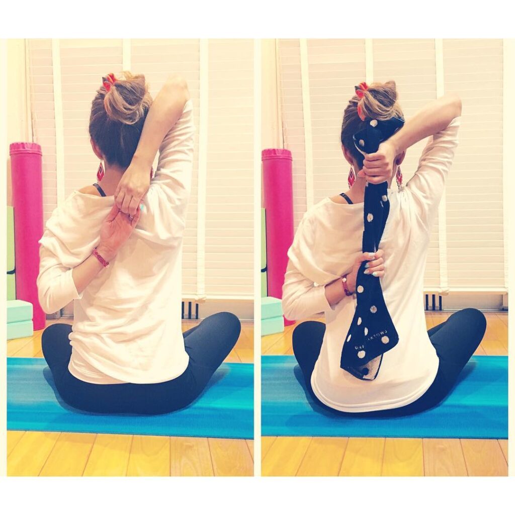*牛面のポーズ月曜日から雨が続いていまひとつな天気。こんなときはこのポーズ#胸を広げる#肩甲骨引き寄せる#背中をしっかり伸ばす#手と手を繋ぐ#繋がらないときはタ…