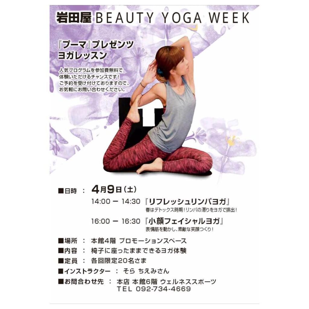 今回はin福岡です・福岡・博多「岩田屋」(百貨店)にてPUMAプレゼンツ 【自分史上・最高の夏美人】をテーマにヨガイベントが行われます。そのインストラクターとし…