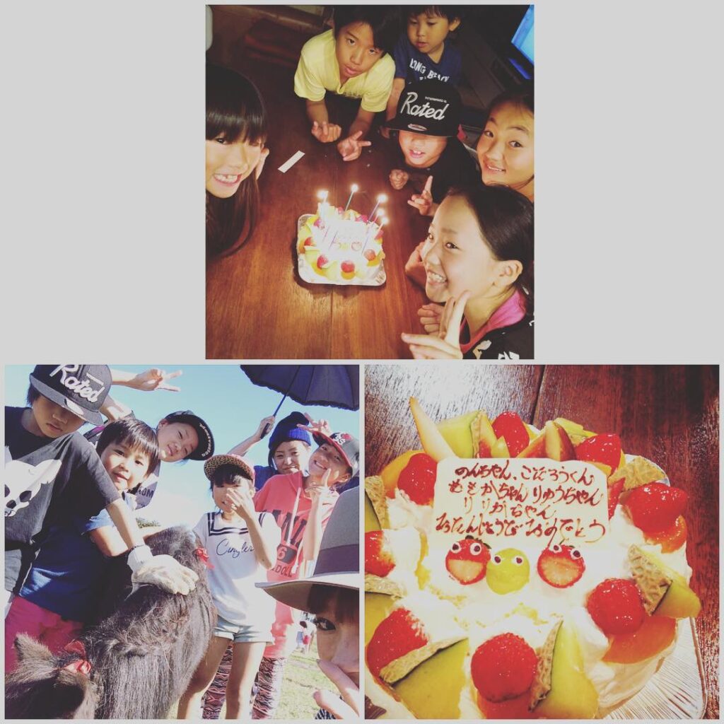 合同誕生会のん、こた、ももか、りゅう、りりかハッピーバースデー#プレート名前連名#誕生日の早い順#ジャザからの芋掘りからの