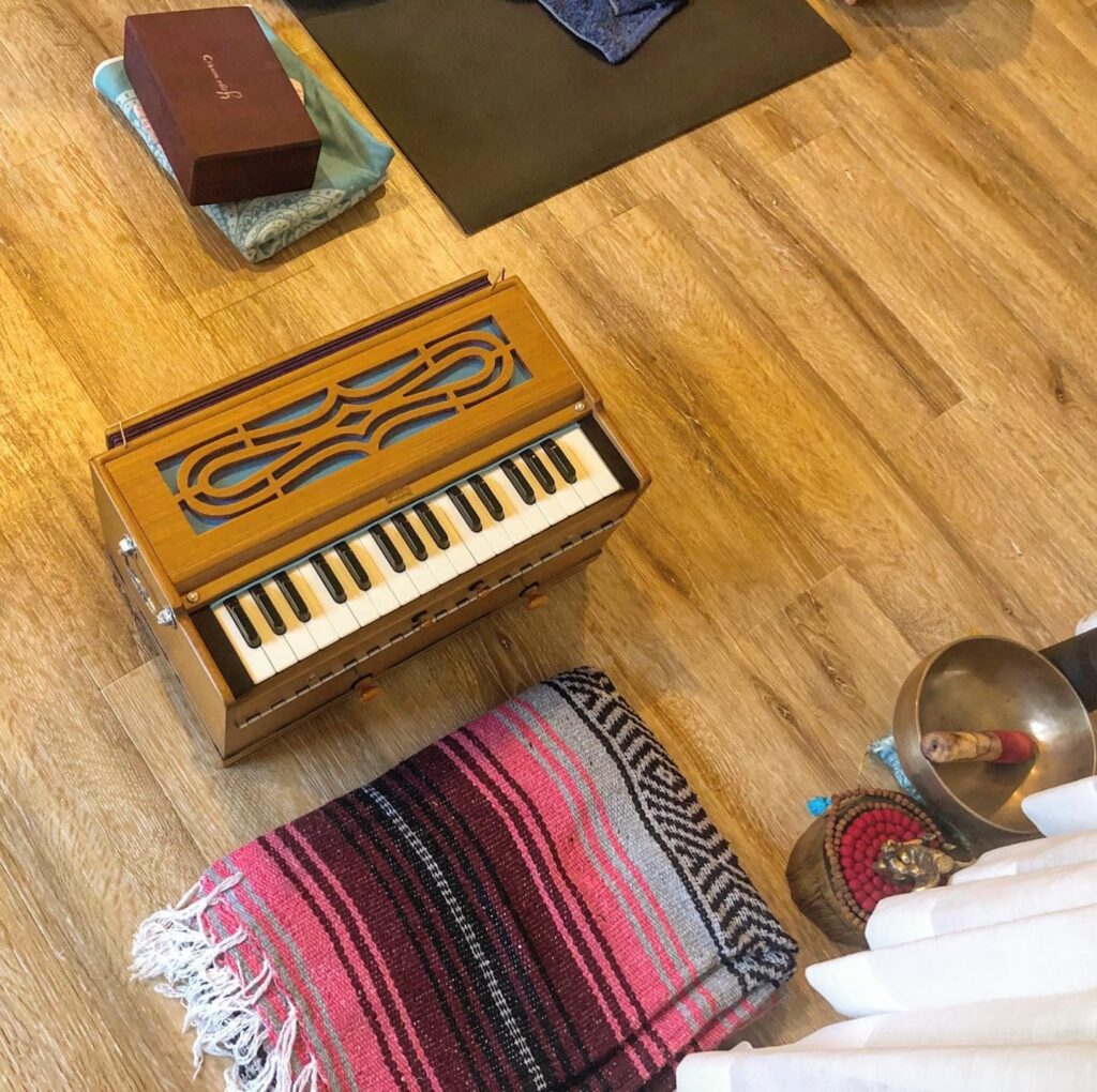Jivamukti yogaでは音(Nada)を大切にしています。ハルモニウムという、このインドの鍵盤楽器。和音が重なり私の声がその上に、みんなの声がまたその上…