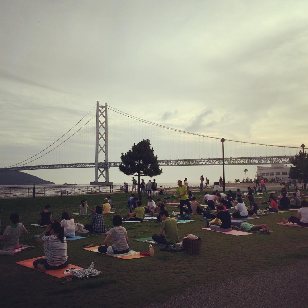 サンセットヨガはじまります。#アジュール舞子#ビーチ#100人ヨガ#無料
