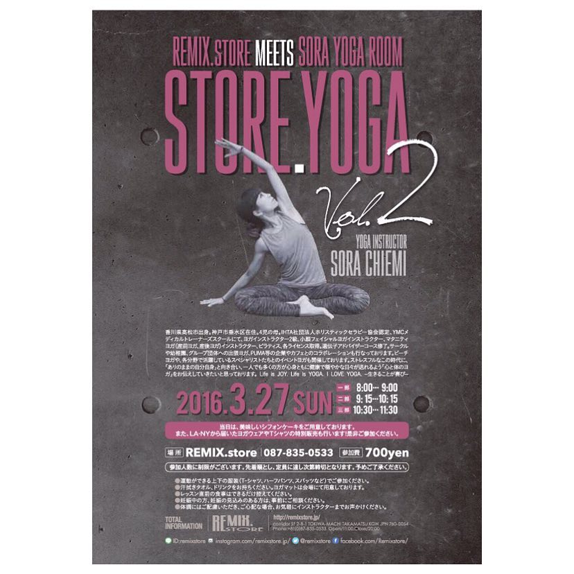 情報解禁・前回大好評だったSTORE.YOGA、第2回目の開催です!高松のみなさん、お待たせです・Vol.2 『STORE.YOGA in REMIX.store』・日時 3/27(SUN) 3部制・○1部 8:00〜9:00 ○2部 9:15〜10:15 ○3部 10:30〜11:30・場所 REMIX.store高松市常盤町2-8-1corridor1Fhttp://remix-store.jugem.jp/・定員 各部12名ずつ・参加料 700円・♡当日は美味しいシフォンケーキをご用意しております。また、L.A.やN.Y.から届いたヨガウェアやTシャツを特別販売いたします。・REMIX.storeは、、、Cool&Feminineをコンセプトに、ブランド名に捉われず国内外のものをセレクト。去年からVintageのものも取り扱っております。・オーナーのこだわりのつまったお洒落な店内で、寒い冬を乗り越えた、エネルギーに満ち溢れた身体を動かし、春の門出にふさわしい朝ヨガしませんか?・興味のある方は是非☆♪ご予約はこちらにコメントかLINEかメールにて受け付けております。・SORAYOGAインストラクター chiemihttp://sorayogaroom.jimdo.com・#yoga #yogi #yogini #yogapic #yogagirl #ヨガインストラクター #SORAYOGA #remixstore #selectshop #コラボ企画 #朝ヨガ #モーニングヨガ #美 #高松