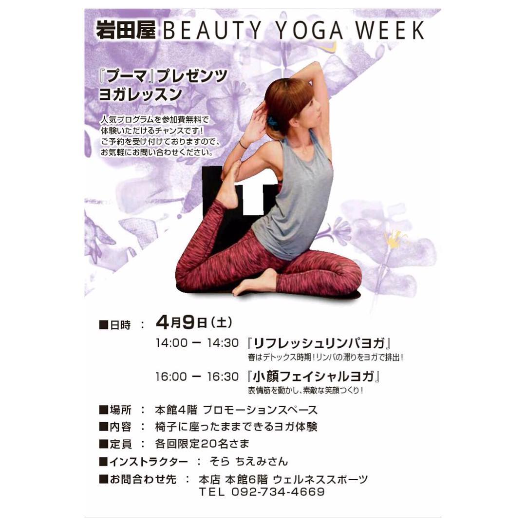 今回はin福岡です・福岡・博多「岩田屋」(百貨店)にてPUMAプレゼンツ 【自分史上・最高の夏美人】をテーマにヨガイベントが行われます。そのインストラクターとしてレッスンを担当することになりました。・■日時 4月9日(土)①14:00〜リフレッシュヨガ②16:00〜フェイシャルヨガ(各約30分、予約制)■場所 岩田屋 4F プロモーションスペース■定員 各20名■参加費 無料http://www.i.iwataya-mitsukoshi.co.jp/real/fashion/sphone/ladies/12493.html・ヨガマットいらずで、仕事の合間や、家庭で簡単にできる!誰でもできる!ようなストレッチやエクササイズを取り入れてインストラクションしていきます。・このチャンスを次に繋げていくためにとにかくがんばります!!緊張でどうなるかわかりませんが、、、笑ま、とにかく、楽しい時間を提供します全力をもってお届けします博多周辺にお住いの方、お近くにお越しの際は是非お立ち寄りください・SORAYOGAインストラクター chiemi#岩田屋 #iwataya #百貨店 #福岡 #博多 #天神 #puma #yoga #event #lesson #beauty #beautifulgirl #spring #SORAYOGA #インストラクター #マット不要 #everyonewelcome #お待ちしております